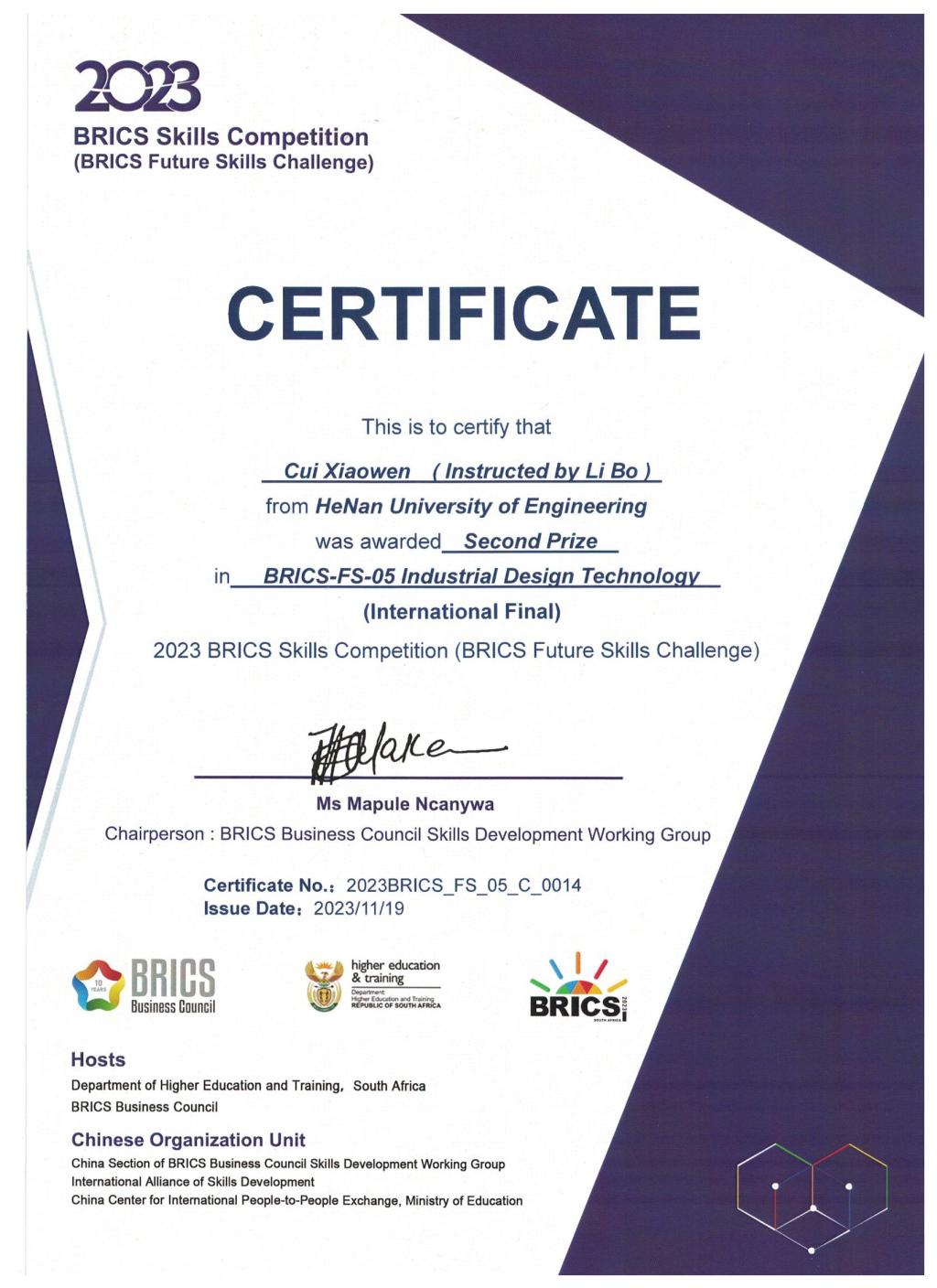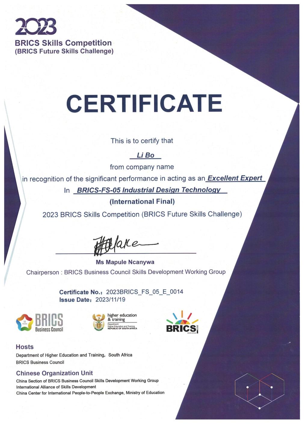 11月17日-19日,2023年“金砖国家职业技能大赛”(金砖国家未来技能挑战赛)工业设计技术赛项国际总决赛于在宁波举行,beat365崔肖文同学获得国际总决赛二等奖,李博老师获 “优秀指导专家”称号。