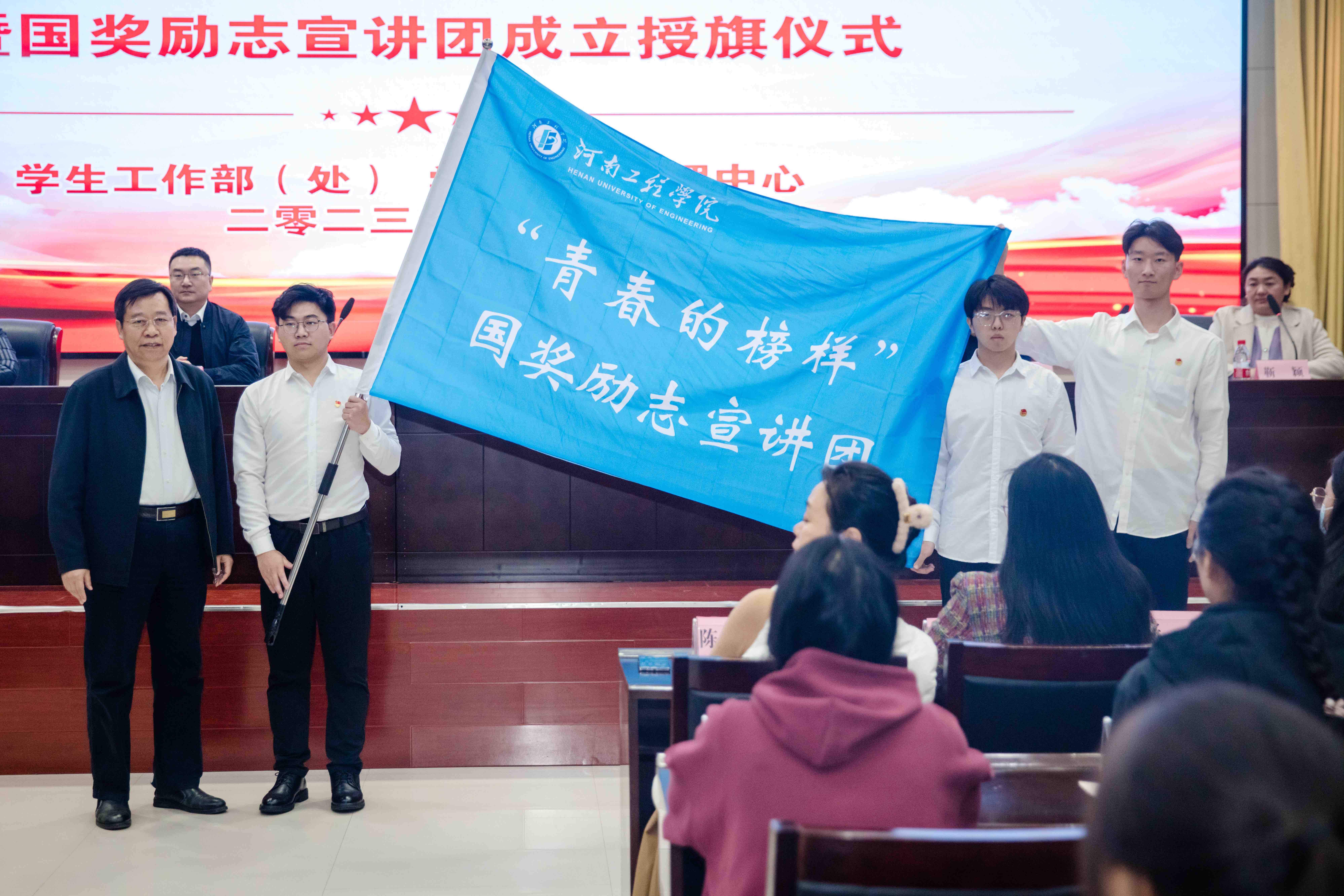 副校长王生交为宣讲团授旗,宣讲团成员代表郭豪杰上台接旗。作为授旗代表的郭豪杰和宣讲团代表的梅书毓依次作表态发言,他们表示成为国奖励志宣讲团的一员倍感荣幸,以后要做好资助政策的“代言人”,用有思想、有温度、有力量的话语讲述属于青年学生的励志故事,以青年视角宣传阐释好党和国家实现教育优先发展促进教育公平的资助体系,打响beat365在线唯一官网“青春的榜样”国奖励志宣讲团这一品牌。