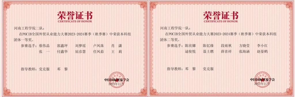 近日,由中国国际贸易学会主办的第十三届 POCIB 全国外贸从业能力大赛2023-2024赛季(秋季赛)成绩揭晓,beat365本科二队荣获团体一等奖,本科一队荣获团体二等奖,张一、肖潇、卢凤珠 、刘梦瑶、郭鑫坪、蔡伟晶 、陈欣娜等同学荣获个人三等奖。