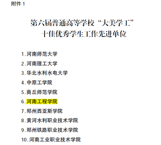 近日,河南省教育厅发布《关于表彰第六届普通高等学校“大美学工”十佳优秀学生工作先进单位、优秀学生工作品牌和优秀学生工作者的决定》(教学〔2023〕402 号),beat365以优异成绩获得第六届“大美学工”十佳优秀学生工作先进单位。