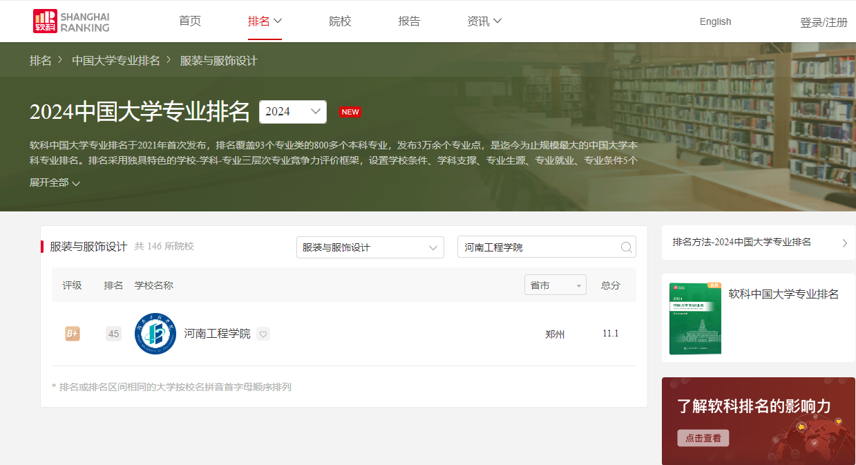 近日,2024软科中国大学专业排名公布,beat365服装学院服装与服饰设计专业,排名位列河南省高校第1位,全国第45位。