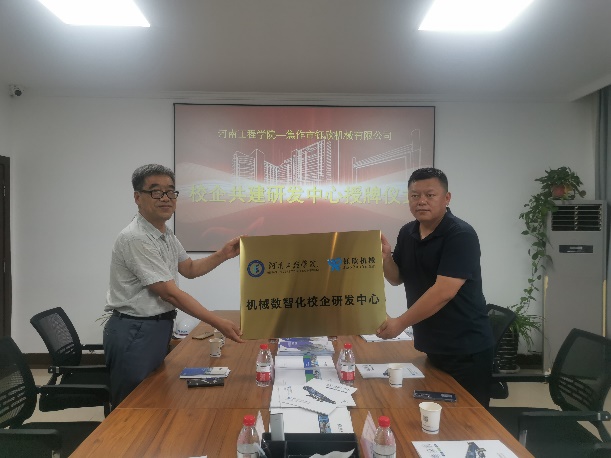 最后,李海东向焦作市亿星锂电科技有限公司、焦作市钰欣机械有限公司颁发了“校企研发中心”的牌匾。双方约定在未来的科技转化、产品研发以及学生实习实训、就业创业等方面开展深度合作,通过人才共育、联合共建、项目合作等方式,实现校企双赢。