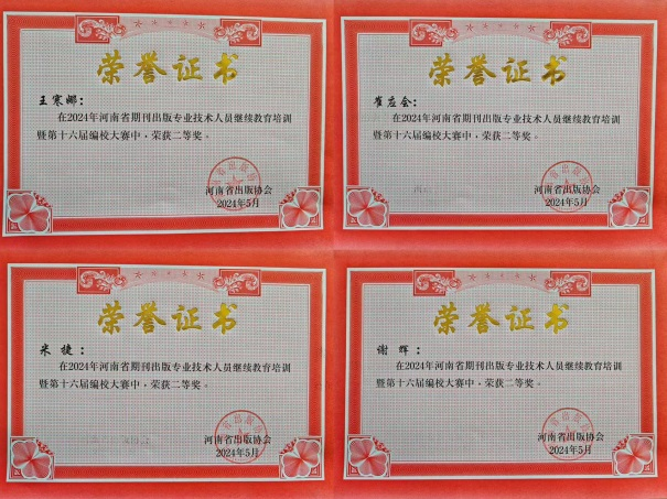 河南省出版协会组织的河南省期刊出版专业技术人员继续教育培训暨第十六届编校大赛于2024年4月16日在河南信阳举行,共有140人参赛。学报编辑部高度重视,积极组织参与,派出4名同志参加了此次编校大赛。经过专家公开、公平、公正阅卷,综合评定,评选出单位优秀组织奖45个,个人一等奖12人,个人二等奖46人。beat365学报编辑部编辑人员在比赛中取得较好的成绩,崔应会、谢辉、米捷、王寒娜均获二等奖,学报编辑部获得优秀组织奖。