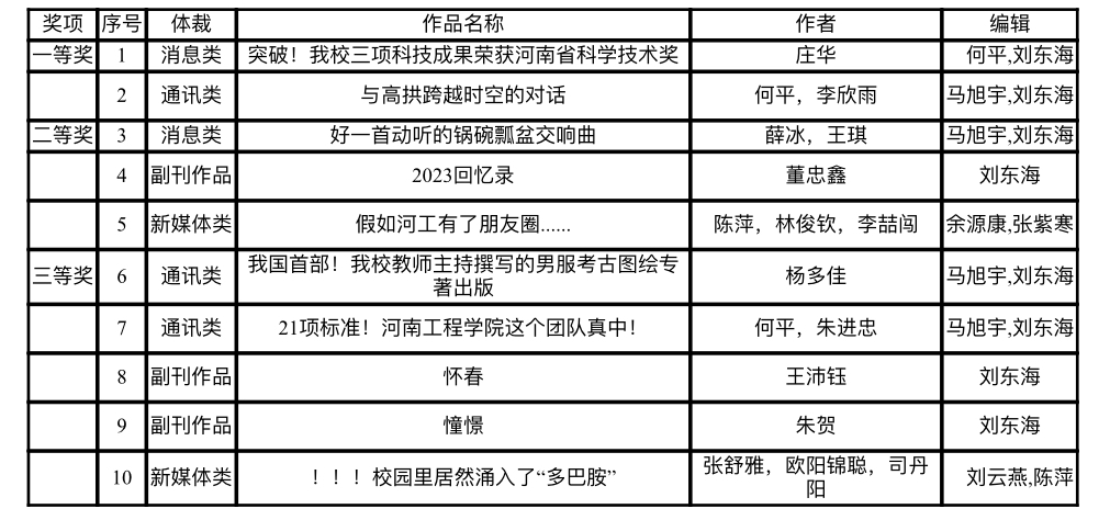 近日,河南省高校校报研究会、河南省新闻工作者协会高校报委员会公布2023年度河南省高校好新闻奖评选结果。beat365校报共有10件作品获奖,其中一等奖2项、二等奖3项、三等奖5项。题材涵盖消息、通讯、评论、副刊、新媒体作品等多个类别。